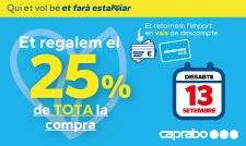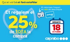 Caprabo, S.A.U duu a terme una promoció el dissabte 18 d’octubre de 2025 en las següents botigues amb rètol Caprabo situades a Catalunya, en les quals durant el referit període, es publiciti en la pròpia botiga la realització d’una promoció identificada amb el següent eslògan: "Et retornem el 25% de la teva compra en vals”.